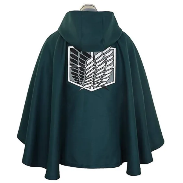 The Attack On Titan Green Cape features a striking printed emblem on the back, representing the Wings of Freedom, symbolizing courage and hope within the story. Detailed stitching enhances the overall finish, ensuring it not only looks screen-accurate but also lasts through repeated wear. The deep green color mirrors the exact tone seen in the series, making it an instantly recognizable piece for fans.