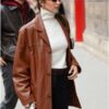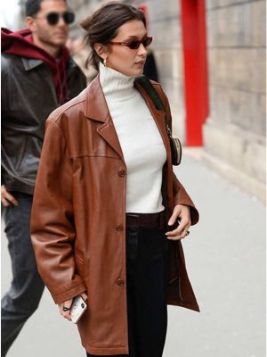 The Bella Hadid Classic Brown Leather Jacket is a timeless wardrobe essential inspired by the effortless, chic style of supermodel Bella Hadid, known for her relaxed yet fashion-forward outfits. Crafted from premium real leather with a soft viscose lining, this jacket combines durability with comfort for everyday wear.Featuring a classic brown finish, a refined lapel collar, and a buttoned front closure, this jacket captures sophisticated simplicity that pairs beautifully with almost any outfit. Functional details like two outside pockets and one inside pocket add practicality while maintaining a streamlined silhouette.Perfect for casual city looks or elevated ensemble layering, this versatile piece transitions effortlessly from day to night. Whether styled with denim and boots or a dress and heels, the Bella Hadid Classic Brown Leather Jacket brings understated elegance and modern flair to your fashion lineup.