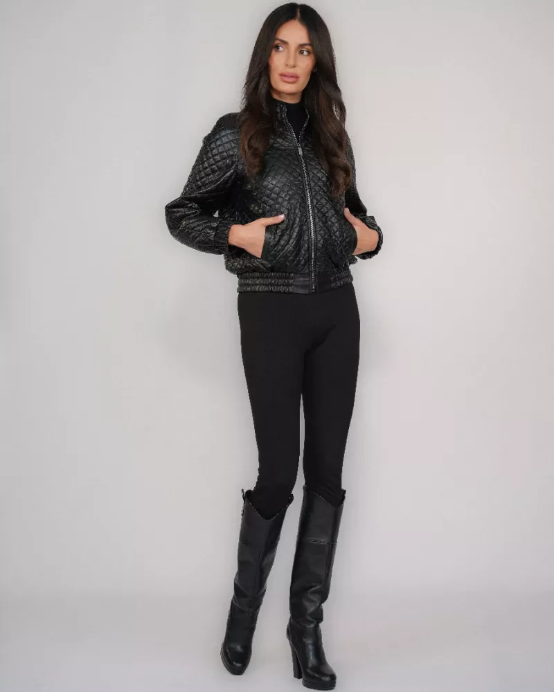 The Black Quilted Leather Bomber Jacket for Women is a stylish and versatile outerwear piece designed to combine luxury, comfort, and modern fashion. Crafted from 100% premium quilted lambskin leather, this jacket features a contemporary silhouette with a classic black finish, making it perfect for everyday wear, evening outings, or casual occasions.Its high stand‑up collar protects against wind, while the front zipper closure ensures easy and secure wear. Two functional side zippered pockets provide practical storage, and the ribbed cuffs and hem deliver a snug, flattering fit. With a total length of 55 cm, this jacket balances elegance with comfort, making it a wardrobe staple for women who value style and quality.Whether paired with jeans, skirts, or tailored trousers, the women’s black quilted leather bomber jacket enhances any outfit with timeless sophistication and modern flair.
