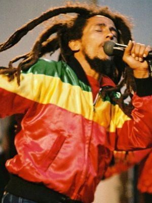 This jacket channels the vibrant, bold spirit associated with Bob Marley’s iconic fashion presence in music culture.