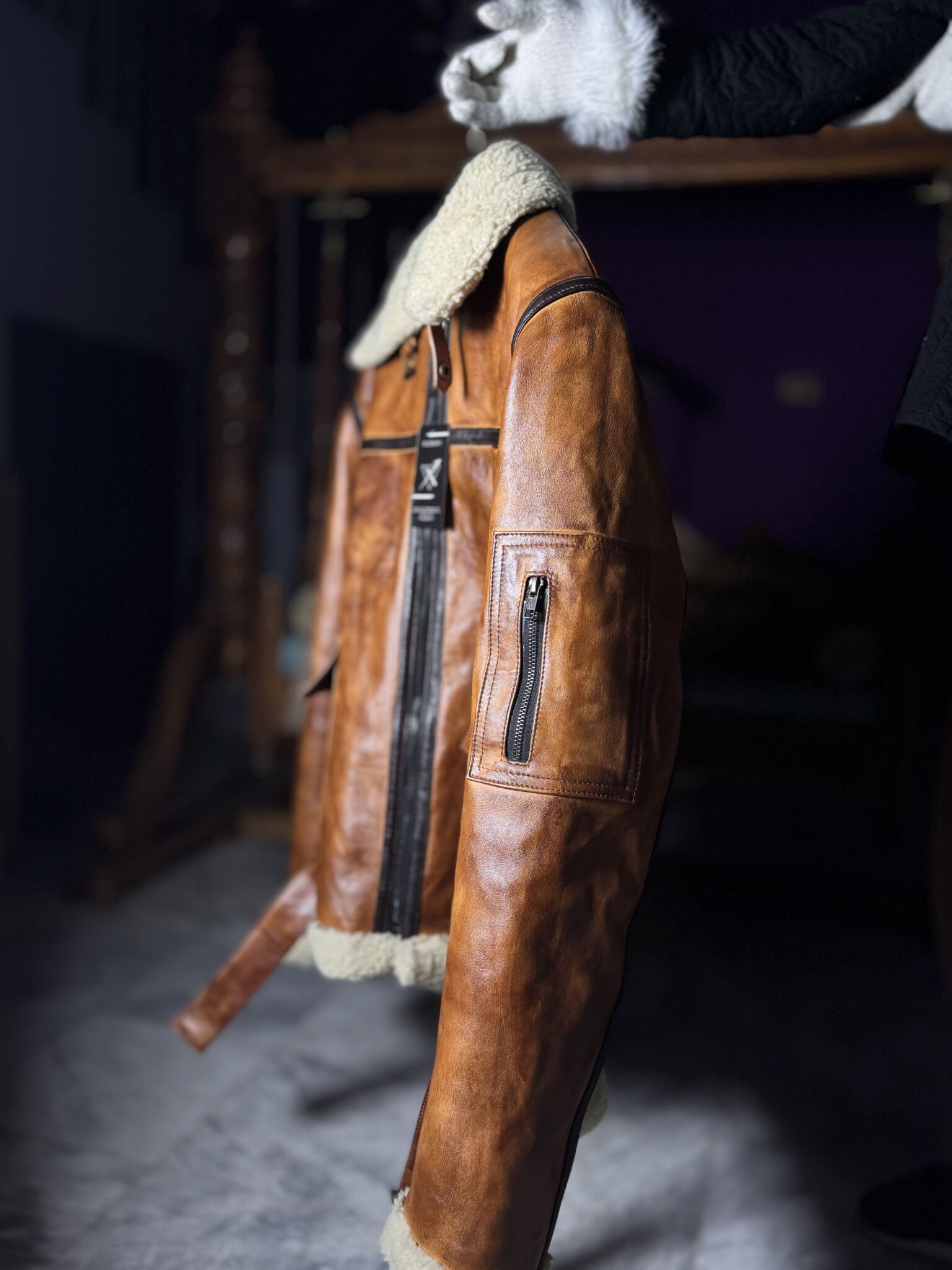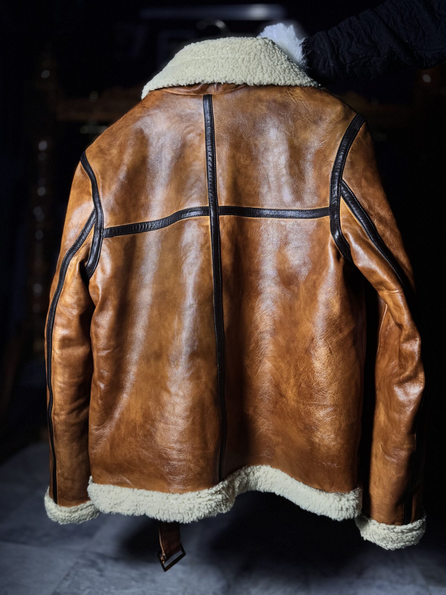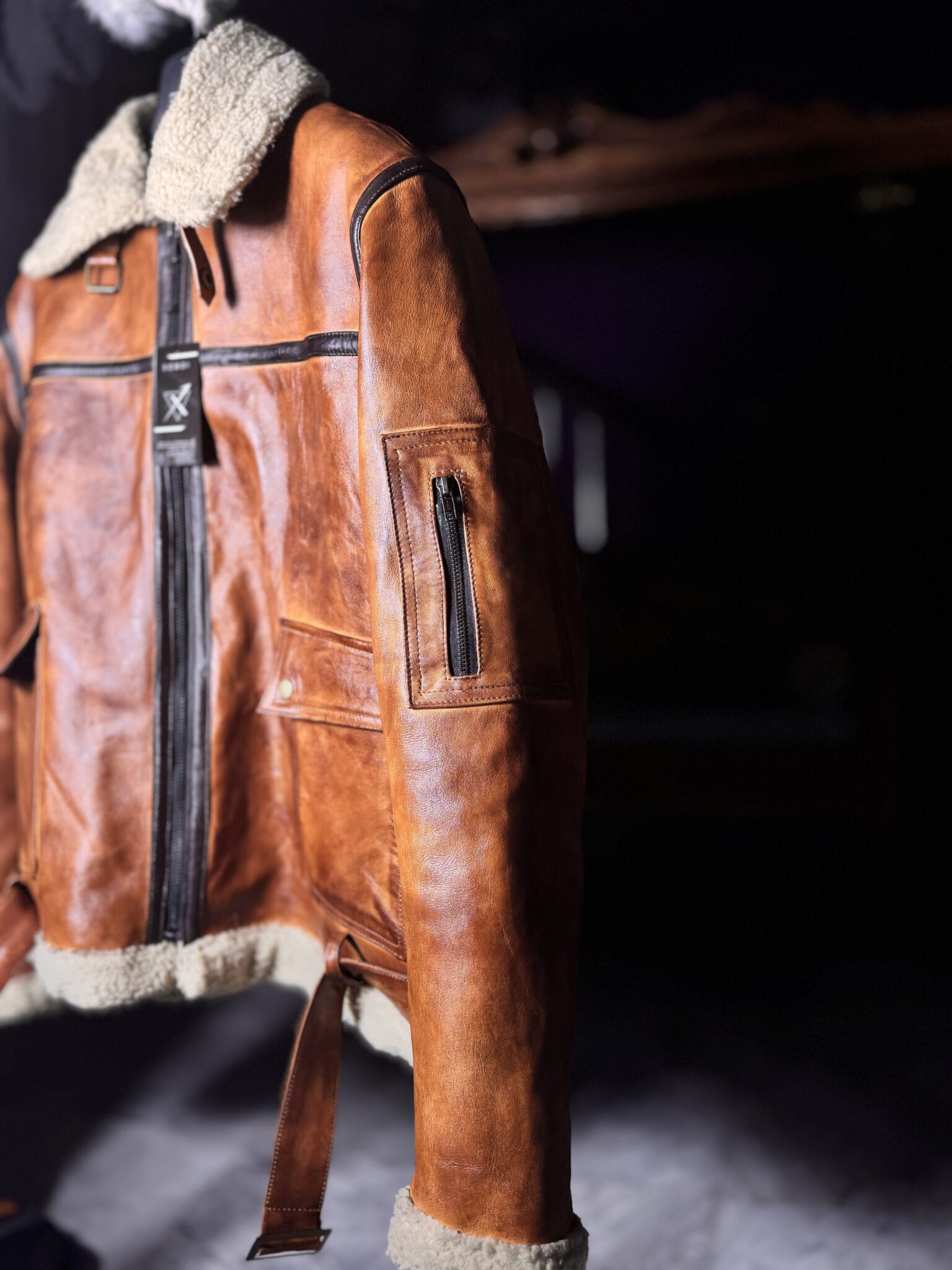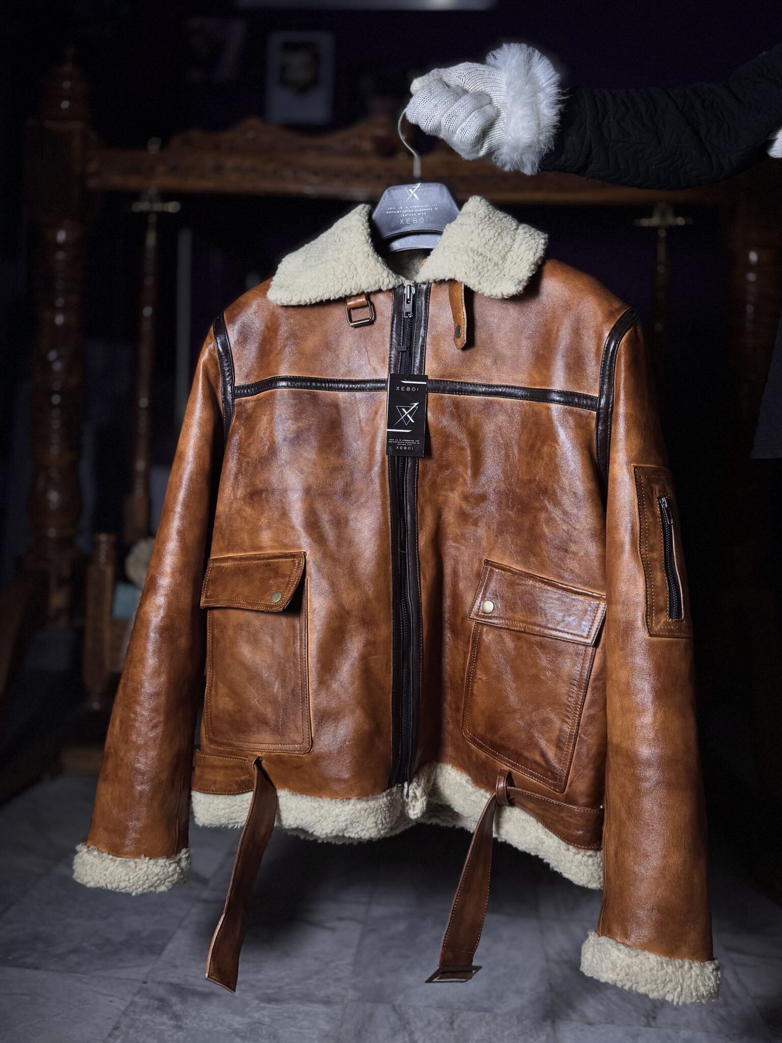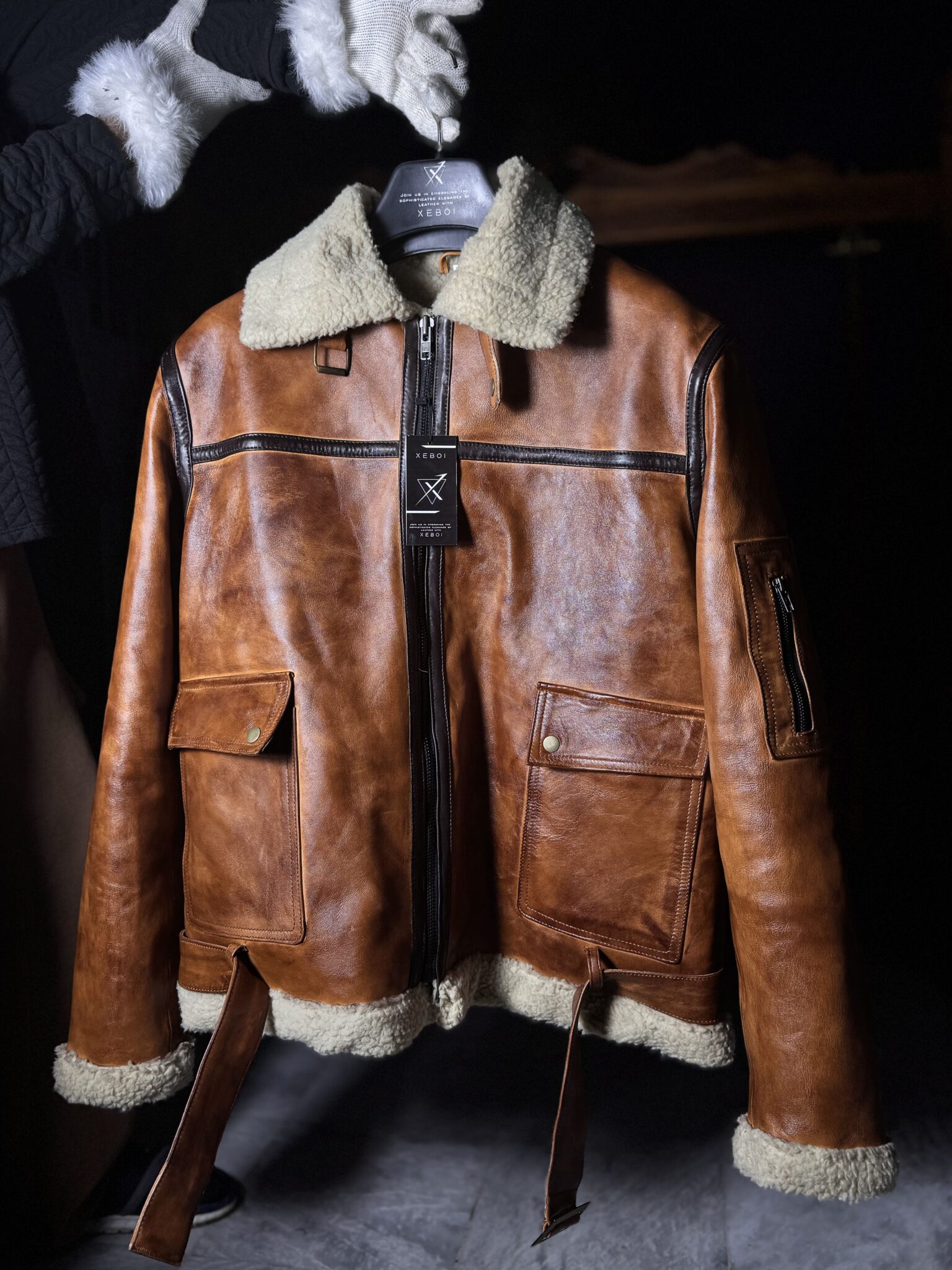 The jacket is finished with a soft shearling collar and cuffs, a durable front zip closure, and thoughtfully placed utility pockets for everyday practicality. Adjustable waist straps add a rugged, aviation-inspired touch while allowing a customized fit.