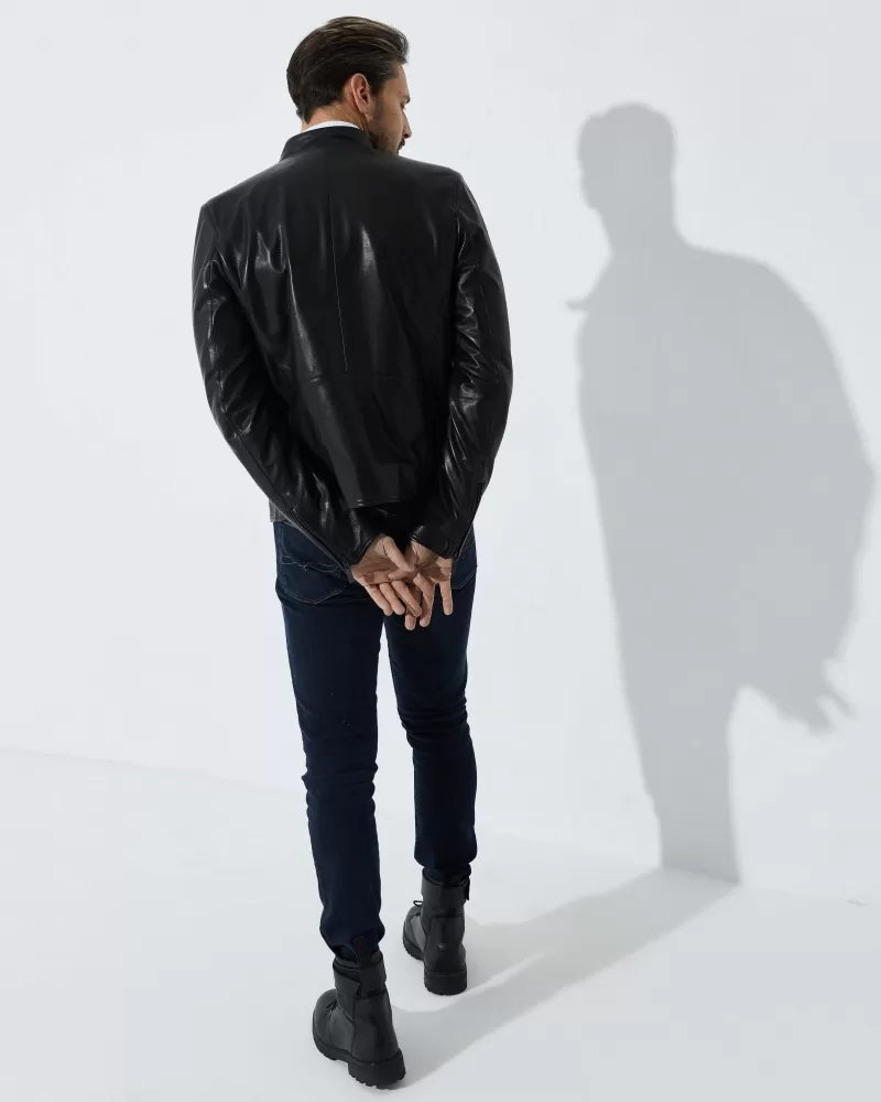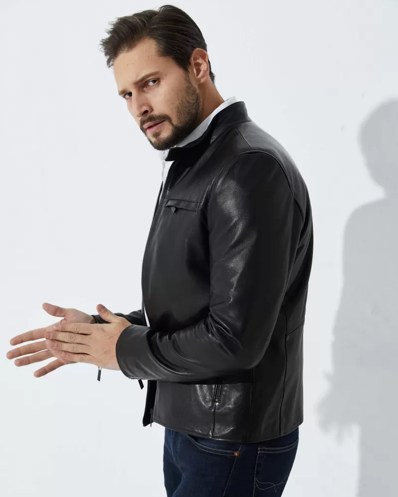The Classic Black Men’s Leather Jacket is a stylish and timeless wardrobe staple crafted from premium lambskin leather. With its sleek black finish and versatile design, this jacket elevates both casual and smart outfits effortlessly. It features a stand-up collar with secure press stud closure, adding classic character and practical wind protection.Made with 100% high-quality chrome-free tanned lambskin and precise stitching, this jacket balances luxury and durability. The front offers multiple zippered pockets, providing convenient storage for essentials while enhancing the jacket’s fashion-forward look. Its 65 cm length delivers comfortable coverage, making it perfect for daily wear or special occasions.Ideal for men who seek timeless style and premium quality, this leather jacket pairs perfectly with jeans, chinos, or tailored pants. Whether you’re dressing up or down, this piece adds a touch of sophistication to any outfit