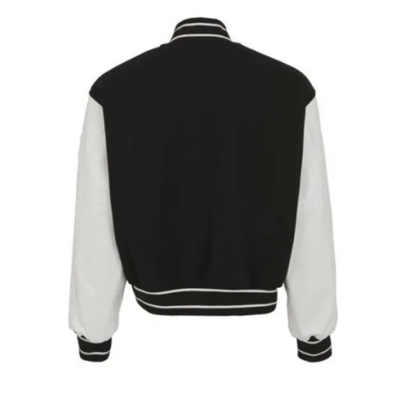 The jacket features a front button closure for a traditional varsity style, complemented by two practical waist pockets that add functionality without compromising elegance. Its deep black color enhances its versatility, making it a standout piece that can be styled effortlessly with casual or semi-formal outfits.
