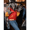 Expertly tailored with a wool body and leather sleeves, it strikes the perfect balance between comfort and durability. The viscose lining provides a smooth, breathable interior, making it ideal for wearing throughout the night. Designed with a rib-knitted collar, cuffs, and hemline, the jacket ensures a snug fit while delivering a sporty, casual vibe. Its front button closure and two waist pockets not only enhance functionality but also add to its stylish appeal. The bold red and yellow color scheme brings energy and vibrancy, echoing the playful yet fashionable mood of Halloween festivities.