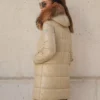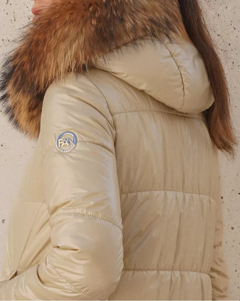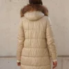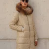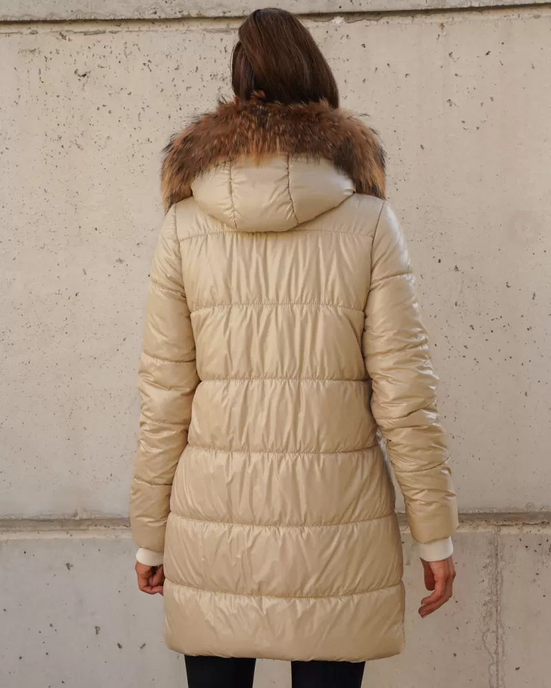 The Pudding Colored Hooded Down Jacket is your ideal winter companion, combining warmth, comfort, and contemporary style. This long down jacket features a water-repellent 100% nylon outer fabric that helps protect you from cold winds and light moisture, making it perfect for chilly weather. Its generous hood is trimmed with luxurious raccoon fur, adding a touch of elegance while enhancing warmth.Inside, the jacket is filled with high-quality eco down insulation for excellent thermal comfort on frosty days. The secure front zipper closure ensures a snug fit, and two patch pockets with press studs offer practical storage for essentials. With a length of about 90 cm, this jacket delivers extended coverage for added protection against the cold.Designed for women who value both style and practicality, this pudding-colored hooded down jacket is a versatile and fashionable choice for winter wardrobes.