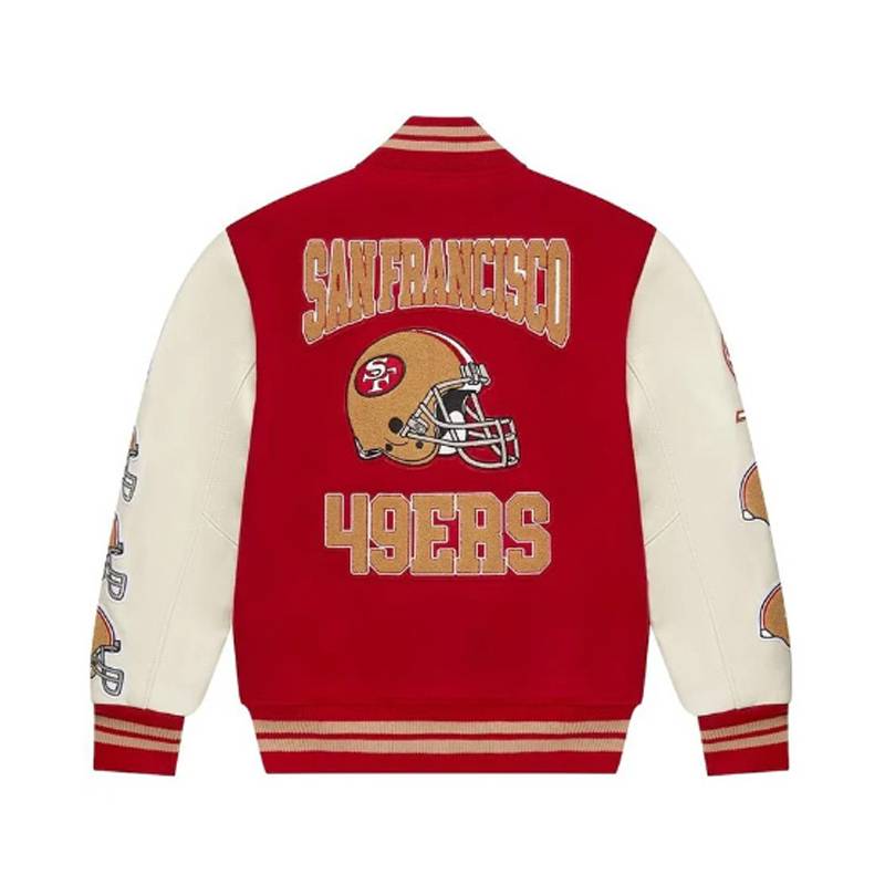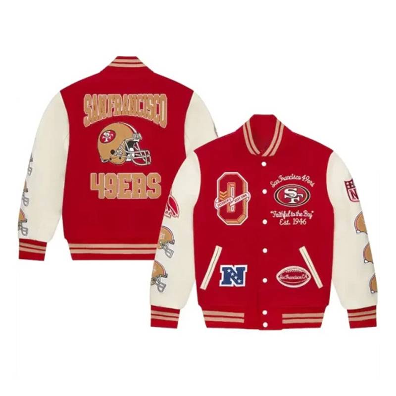 Making the jacket so special is the bold red and white color combination that REALLY stands for the team colors. The quality stitching and also the fine patch detail define an eye-catching element of pride. Don’t miss this perfect souvenir to any die-hard 49er fan. It’s the ideal wear if you’re headed to the stadium or want that effortless casual streetwear vibe. Integrated into the collection of 49ers Jersey Jackets, this sporting pride wear piece is one of the most timeless fashion statements. It is made as a 49ers Unisex Varsity Jacket and fits all fans styles, making the San Francisco 49ers Letterman Jacket essential for showing one’s team spirit in style.