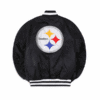 Its front zipper closure ensures ease and style, while the long sleeves keep you warm without compromising on movement. With two waist pockets, you can carry your essentials while keeping your hands warm. The deep black color makes this jacket versatile and timeless, pairing well with any outfit. Perfectly blending a classic varsity vibe with modern sportswear appeal, this Steelers Varsity Jacket Super Bowl is a must-have for fans. Elevate your game-day wardrobe with the Super Bowl Steelers Satin Jacket, a true symbol of victory and loyalty.