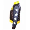 Designed with a stand-up collar, front zipper closure, and long sleeves with open hem cuffs, the jacket captures the essence of Wonder Woman’s powerful and stylish costume. The vibrant multi-color design pays homage to the superhero’s classic armor, blending red, blue, and gold hues to create a striking look. Two waist pockets add practicality without compromising its sleek appeal.